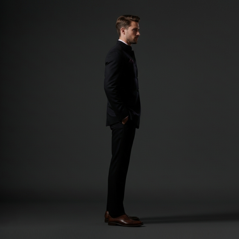 Heritage Reimagined: Features the iconic mandarin collar (Bandhgala) and a five-button front, blending bourgeois codes with contemporary refinement.